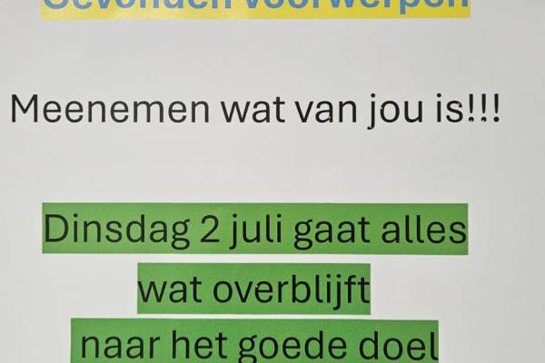 Zoals gebruikelijk worden aan het einde van het schooljaar alle gevonden voorwerpen, jassen, tassen, gymspullen enz. uitgestald in de garderobe om iedereen de gelegenheid te geven hetgeen kwijt geraakt is alsnog terug te vinden. Na 2 juli (laatste schooldag) wordt alles wat overblijft aan het goede doel gegeven. Hopelijk komen de spullen weer bij de juiste eigenaar terecht.